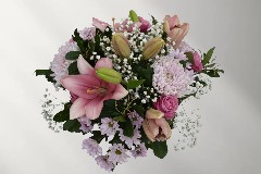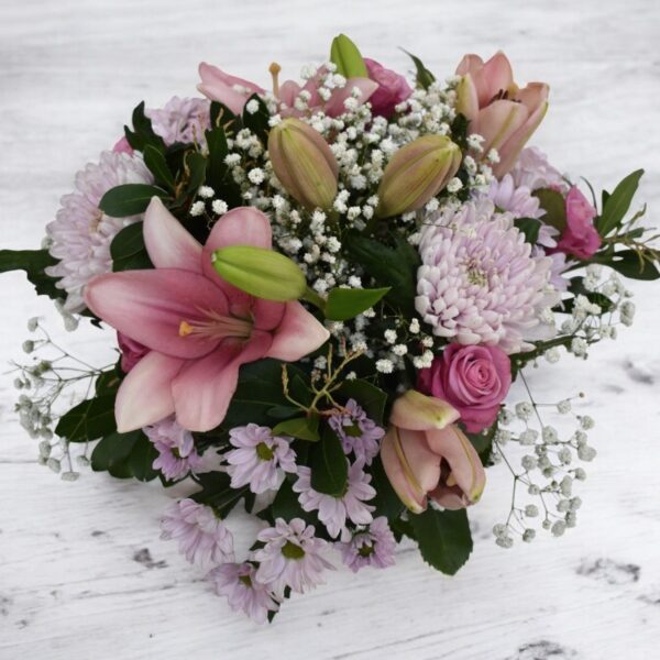 Μπουκέτο με ζερμπερες, χρυσανθεμα, οριενταλ και τριαντάφυλλα σε ροζ λευκες αποχρώσεις.
