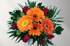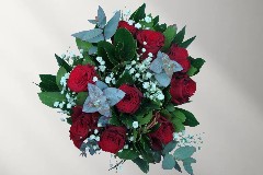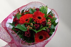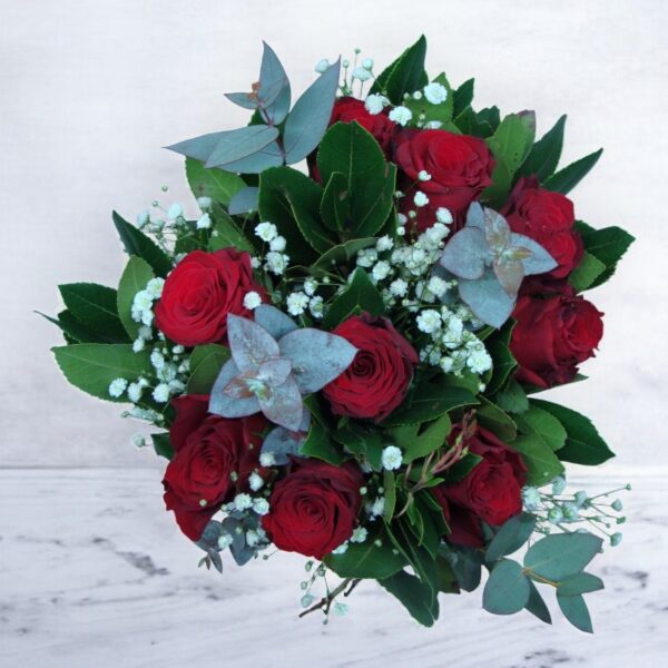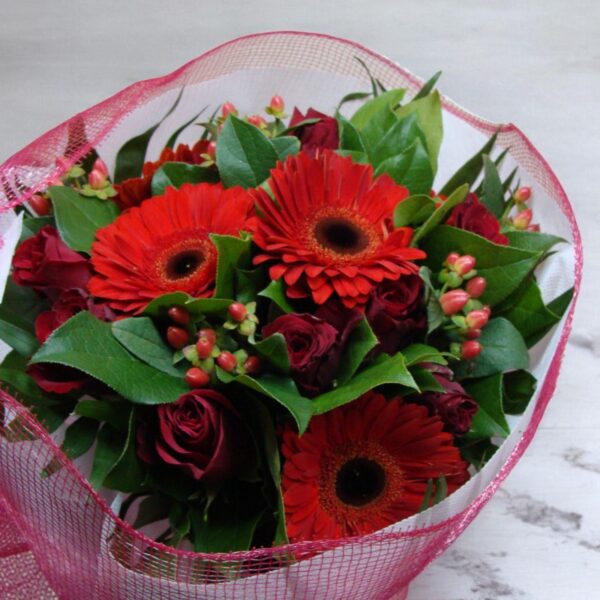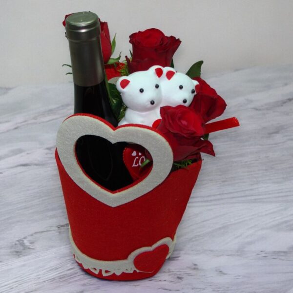 Κατακόκκινη διπλής όψεος σύνθεση με διάφορα άνθη, τοποθέτημενη σε κόκκινο κασπώ διακοσμημένο με ξύλινη λευκή καρδιά. Ιδανική για την διακόσμηση ενός τραπεζιού ώστε να την απολαμβάνεται απ’ όλες τις μεριές.