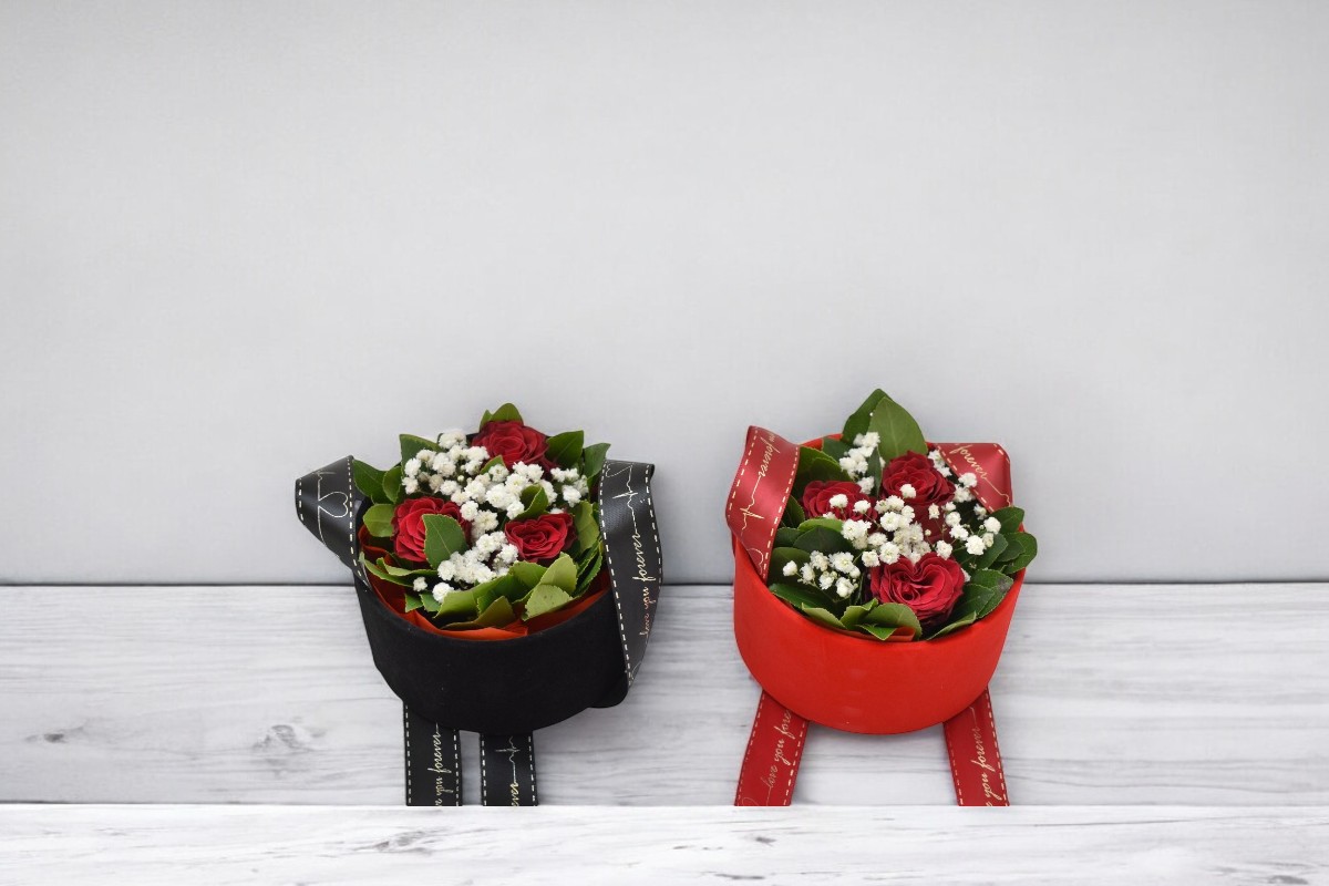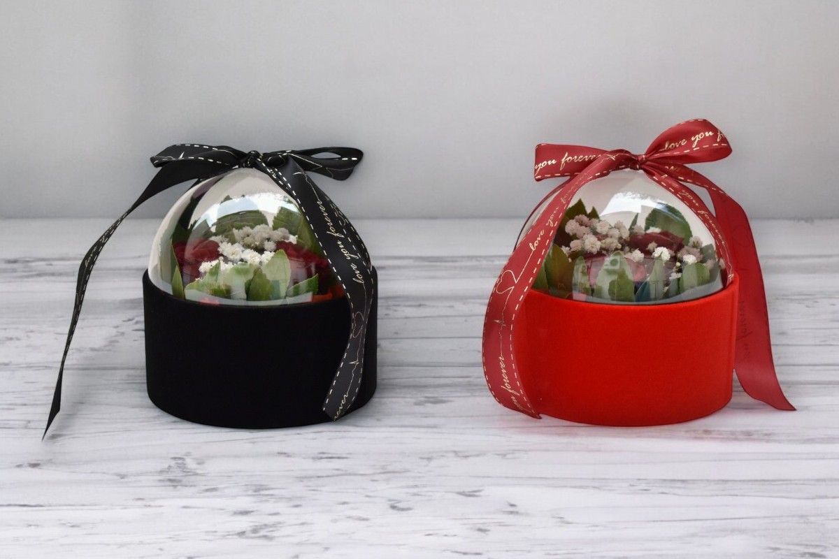 Σύνθεση με κόκκινα τριαντάφυλλα σε όμορφο κουτάκι με καπάκι. Υπάρχει και δυνατότητα επιλογής σε μαύρο ή κόκκινο κουτί.