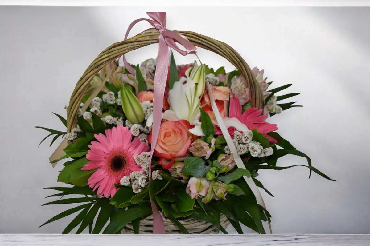 Σύνθεση με τριαντάφυλλα Εκουαδόρ , ζέρμπερες και αλστρομέριες σε ροζ και λευκό χρώμα.