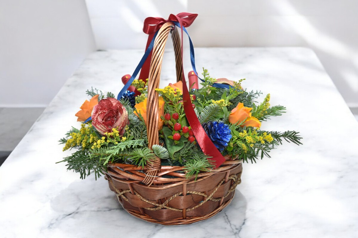 Εορτάστική σύνθεση σε καλάθι με 2 μπουκάλια κρασί.