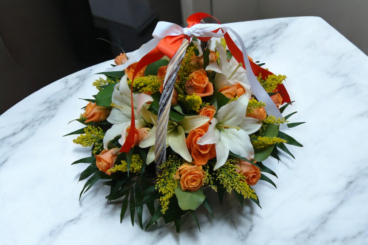 Καλάθι με λίλιουμ,τριαντάφυλλο και σολιντακο .