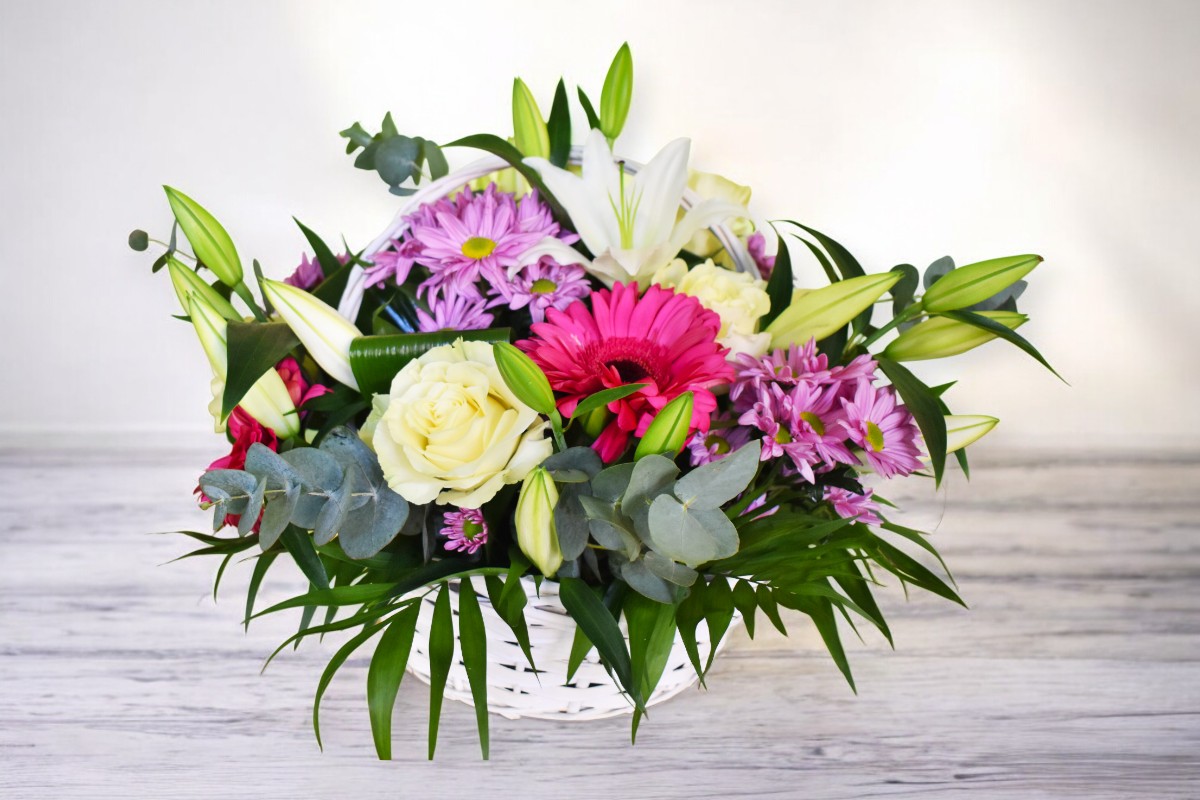 Δροσερό καλάθι με τριαντάφυλλα, χρυσάνθεμα και ζέρμπερες σε λευκές και φούξια αποχρώσεις.