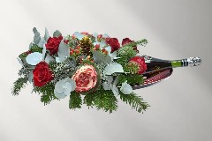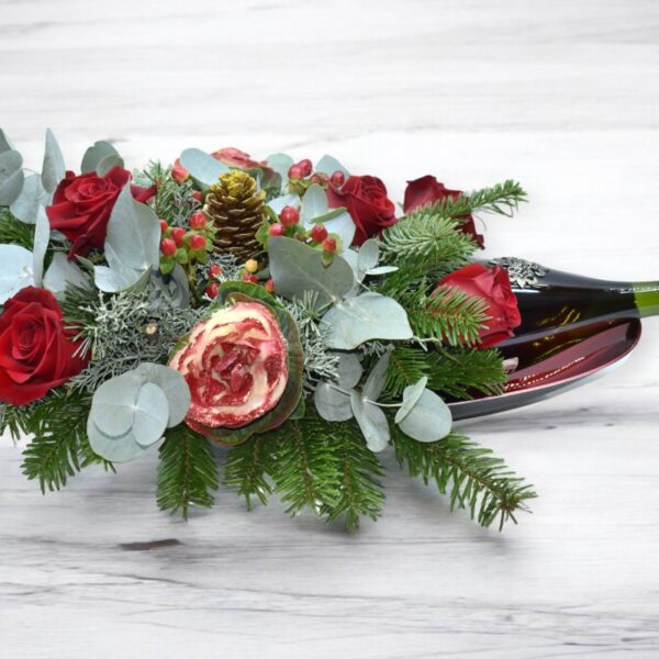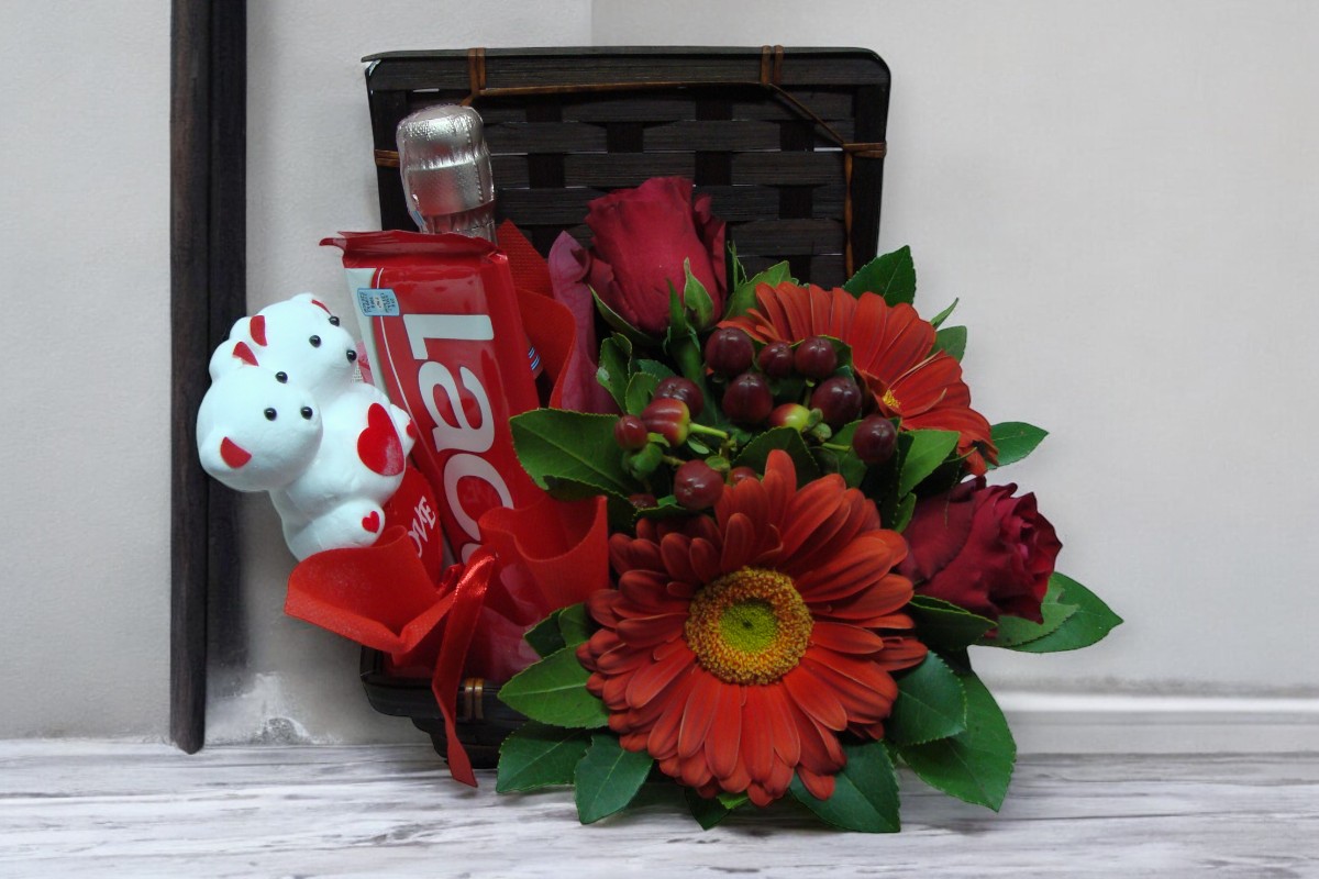 Μπαουλάκι με σαμπάνια, σοκολάτα και σύνθεση με κόκκινα λουλούδια.