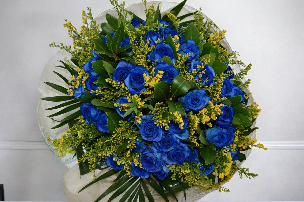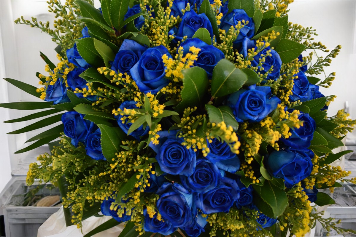 Εντυπωσιακό μπουκέτο από 46 μπλε τριαντάφυλλα, σολιντάκο και πρασινάδες.