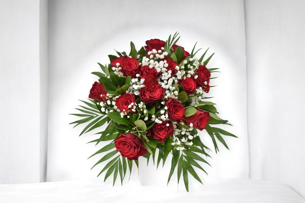 15 κόκκινα τριαντάφυλλα αρμονικά συνδυασμένα με διάφορα φυλλώματα.