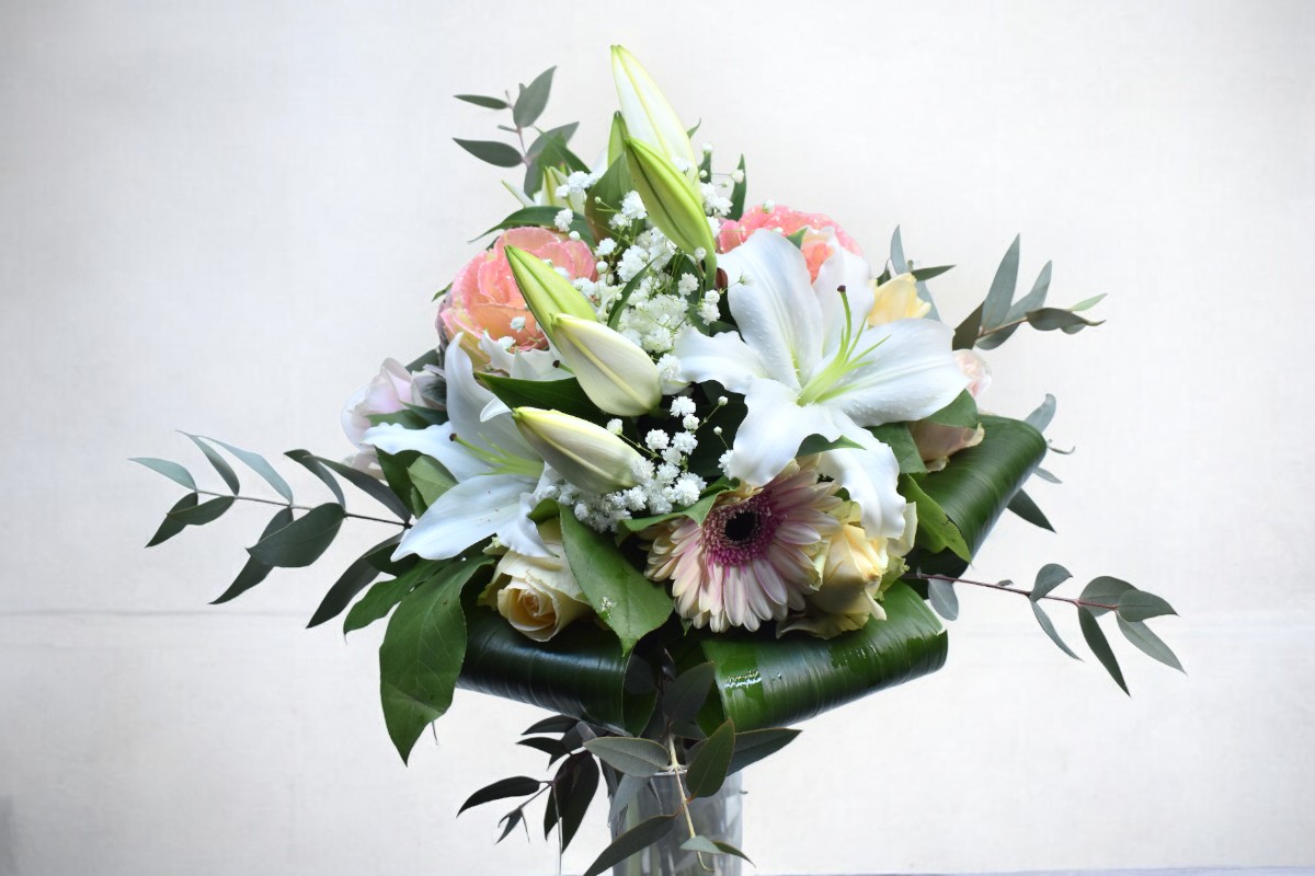Μπουκέτο σε πάλ χρώματα με τριαντάφυλλα, ζέρμπερες οριεντάλ και μπρασικά