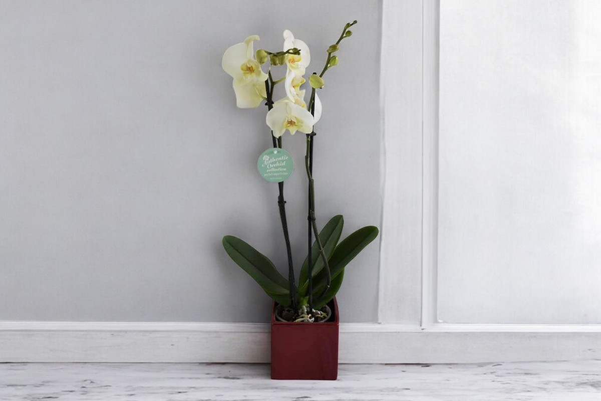 Ορχιδέα φαλαινόψις σε τετράγωνο πήλινο κασπώ