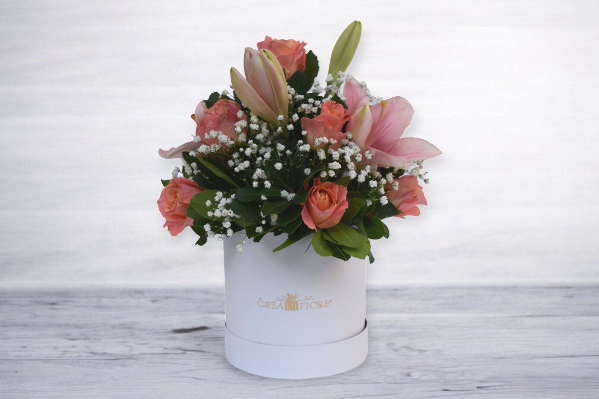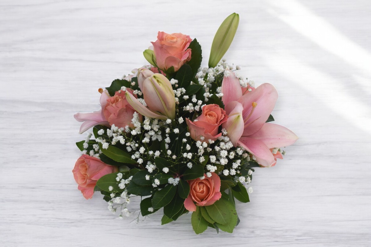 Ροζ σύνθεση σε όμορφους χρωματισμούς απο λίλιουμ και τριαντάφυλλα.
