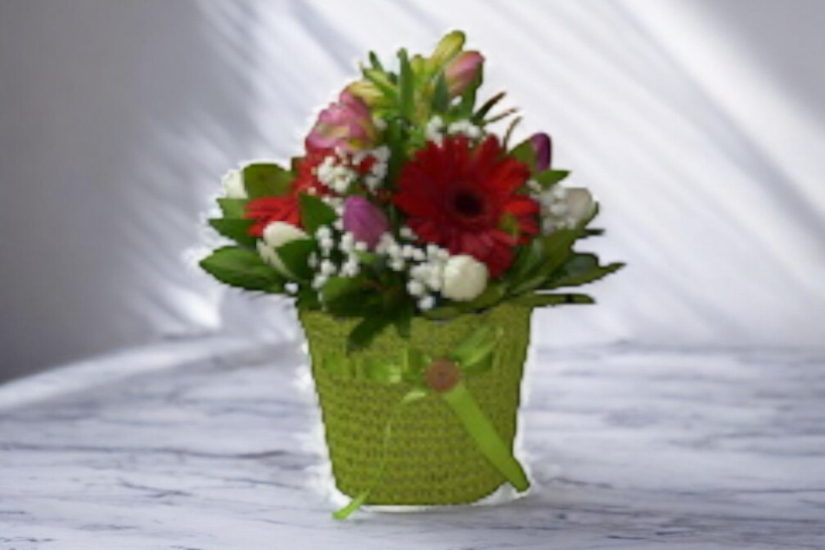 Σύνθεση με πολύχρωμες τουλίπες, ζέρμπερες και αλστρομέρις