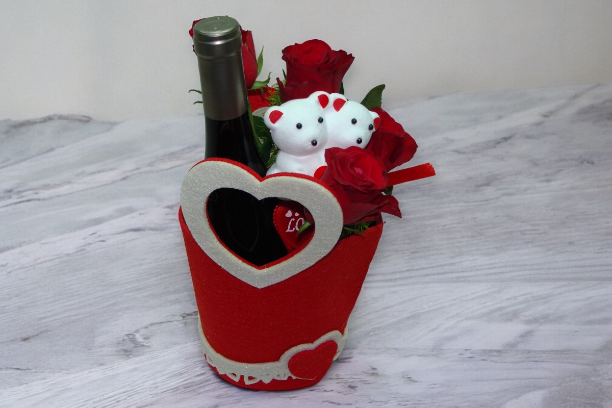 Υφασμάτινο ποτ με τριαντάφυλλα, κρασί σαμπανιζέ και αρκουδάκια.