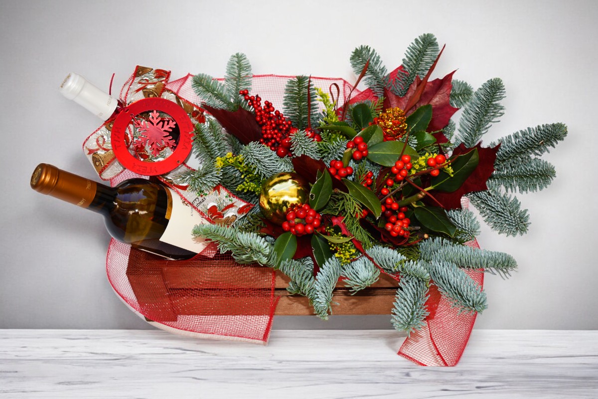 Τελάρο με Χριστουγεννιάτικη σύνθεση και κρασιά. Τα κρασιά είναι ο Βυσσινόκηπος και οι Πέτρινες πλαγιές του Κτήματος Παλυβού στην περιοχή της Αρχαίας Νεμέας.
